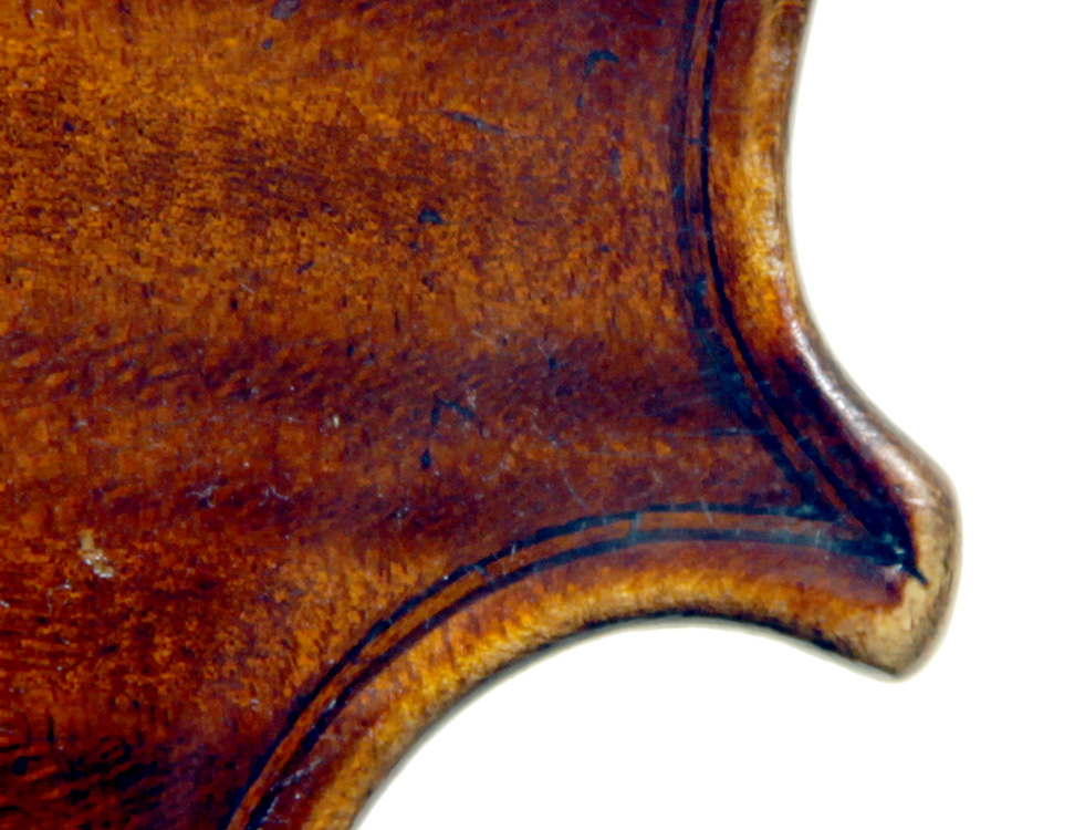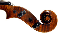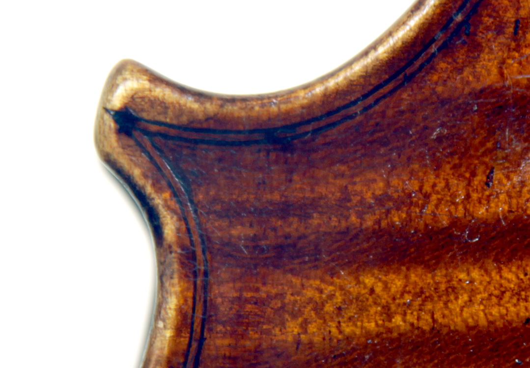 The two piece back, ribs, neck and scroll are of attractive, nicely-flamed maple with a medium to broad curl. The top is of excellent medium grain tone spruce. The varnish appears to be oil based and compliments the materials well. Workmanship throughout is refined and of high quality. The scroll in particular is very well balanced.