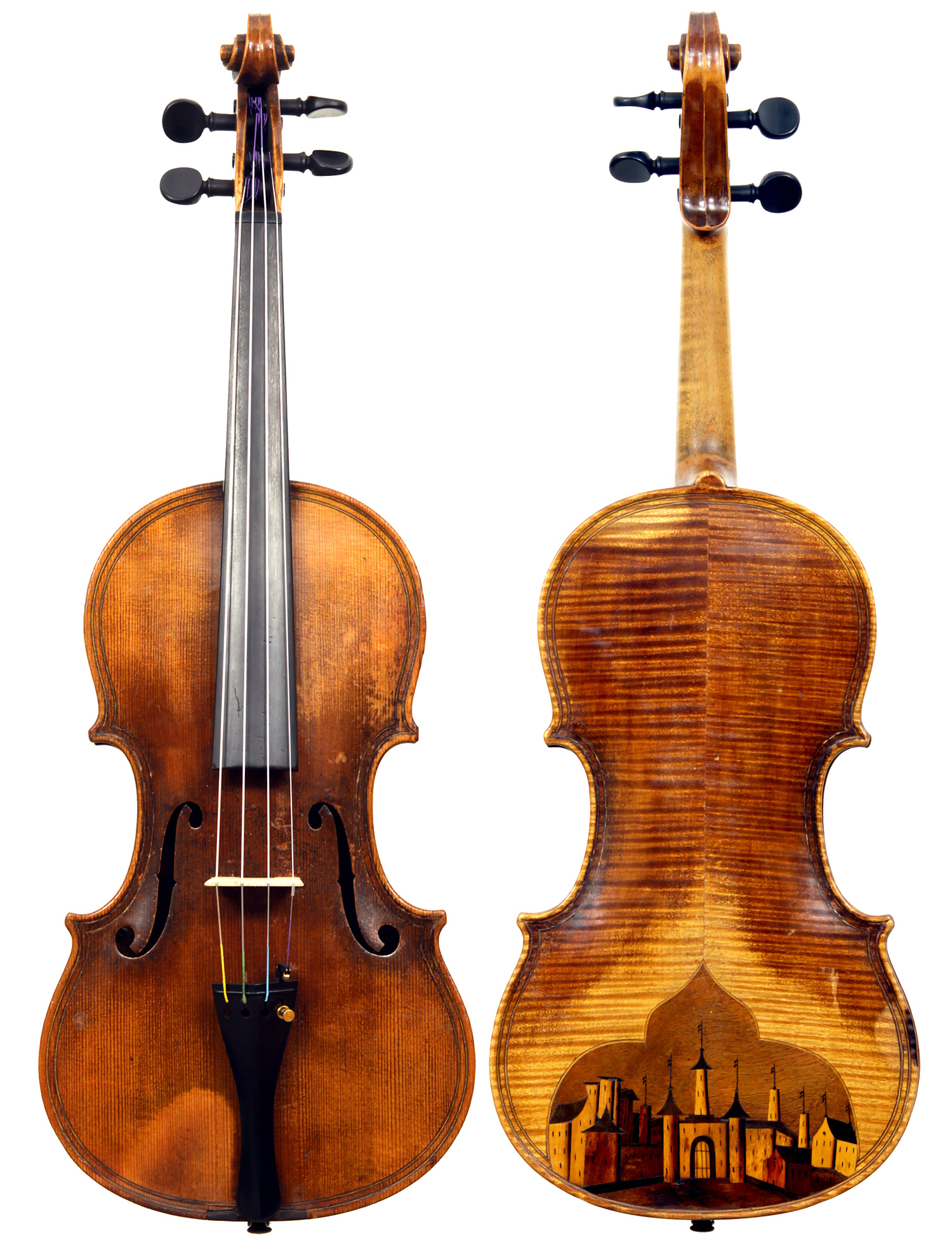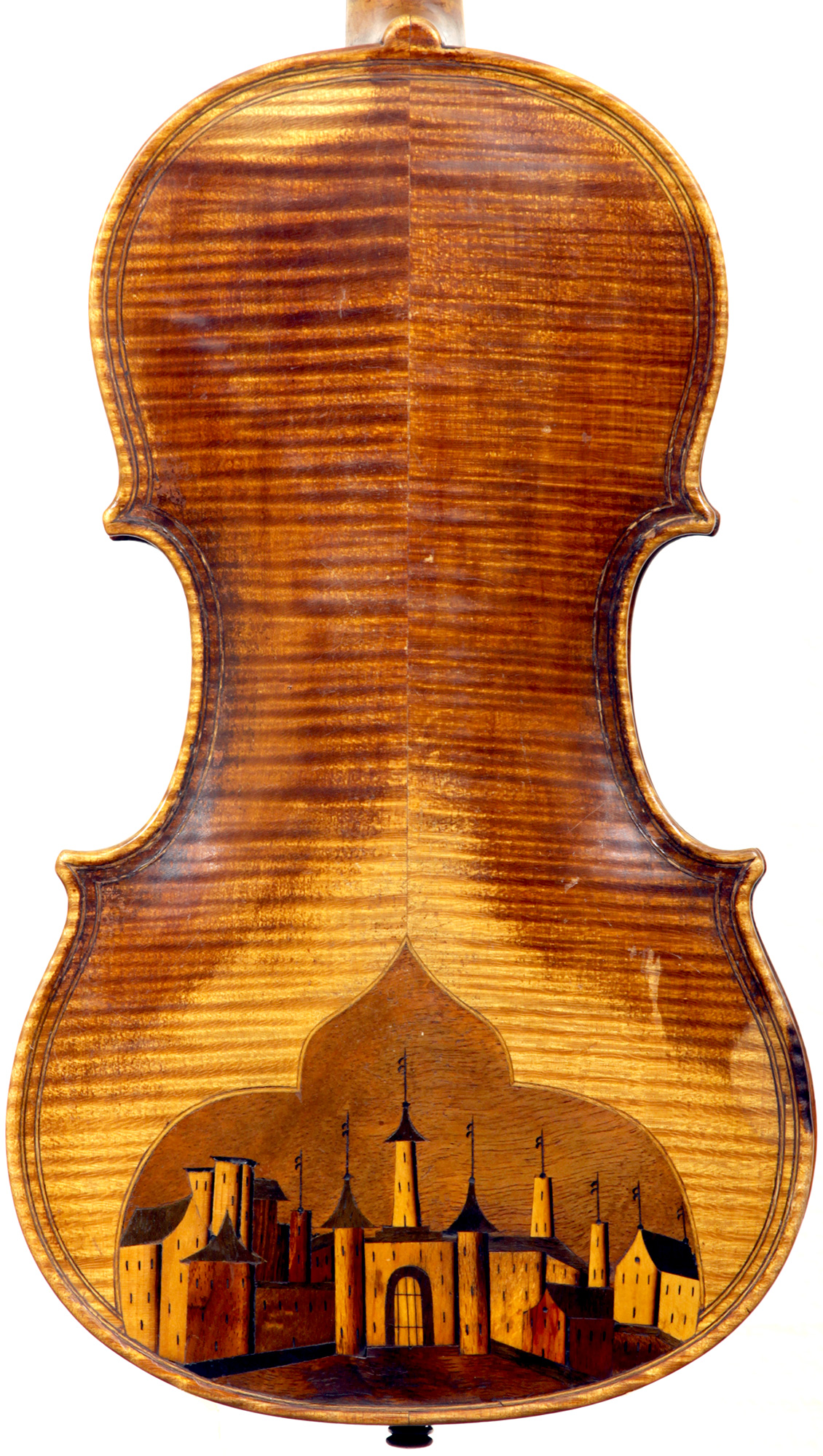 Gaspard Duiffoprugcar is fanciful rendering of the name, Kasper Tieffenbrucker, a violinmaker who was born near Fuessen in Bavaria in 1514.This violin is a very fine example of the numerous copies of Gaspard Duiffoprugcar's work, produced in Mirecourt, and also in Saxony - those by the Derazey workshop being highly respected as very serious instruments, built to the high standards associated with the Derazey tradition. It features an inlaid city tableau in the back, reminiscent of the religious section of the city of Lyons in France, with the St Sebastian church and surrounding monastic buildings.