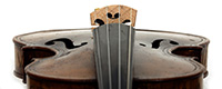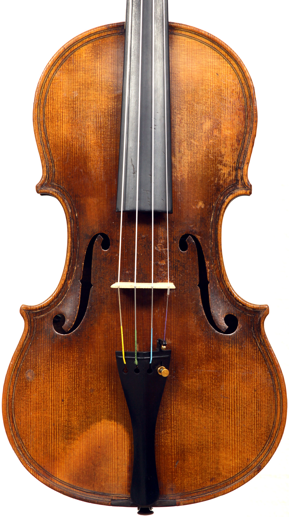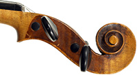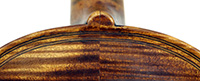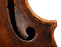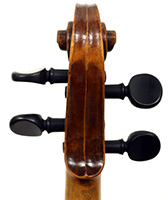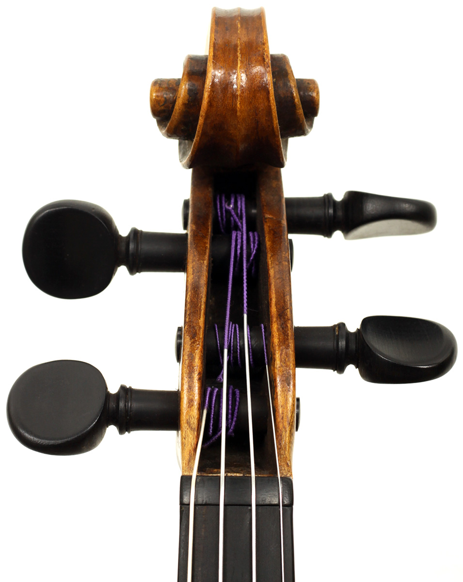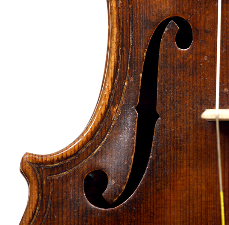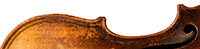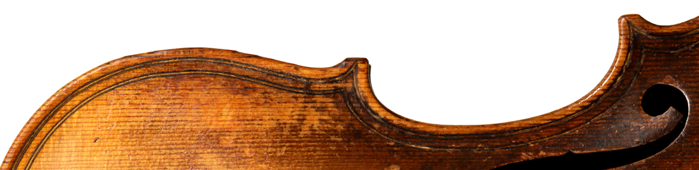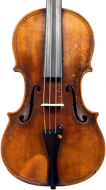 This violin is built on the Maggini pattern, which is slightly wider and longer than usual with fairly flat arching, double purfling and elongated sound holes. These copies were very popular among violin making workshops in France and Germany. The master, J. B. Vuillaume, had many Maggini copies made in his workshops as did the French firm of Jérôme Thibouville-Lamy and the workshop and studio of Justin Derazey, to which this instrument is attributed.