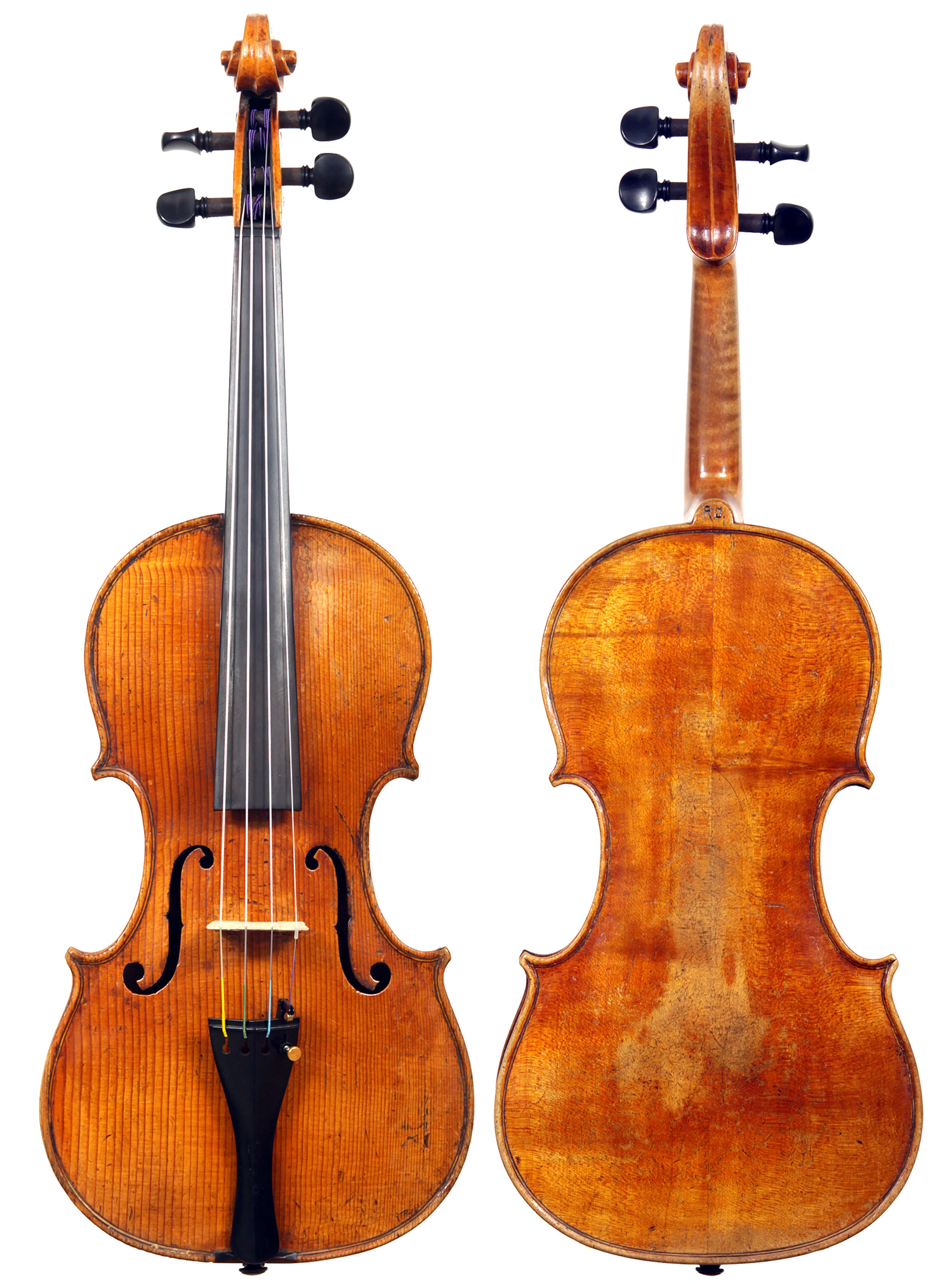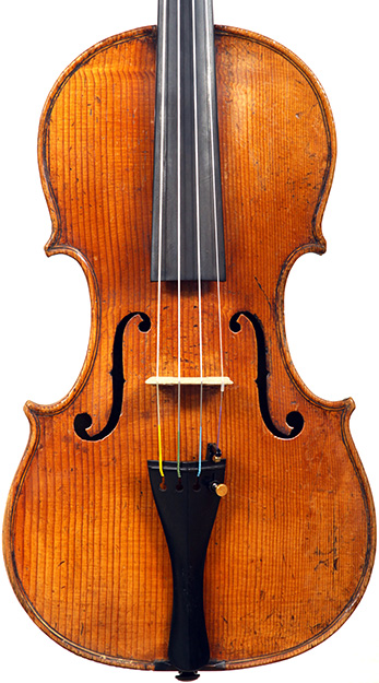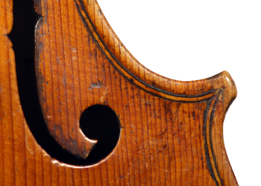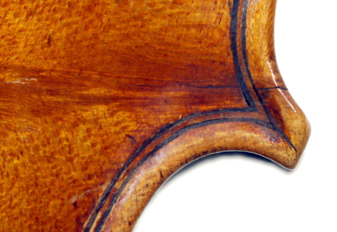 Much about this instrument intrigues: according to the foremost dendrochronologist, Peter Ratcliff, it was made after 1850, yet it has a perfectly executed neck graft (one of the best I've seen). This violin bears signs of much use, but is virtually in perfect structural condition. Furthermore, the central strip in the purfling appears to be of baleen (whalebone).