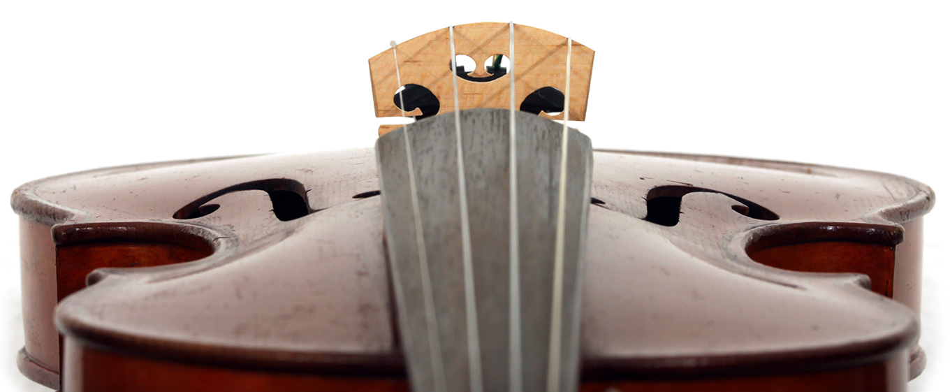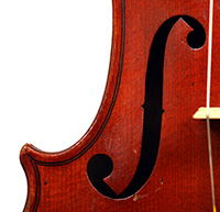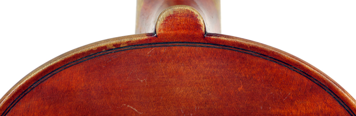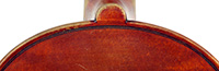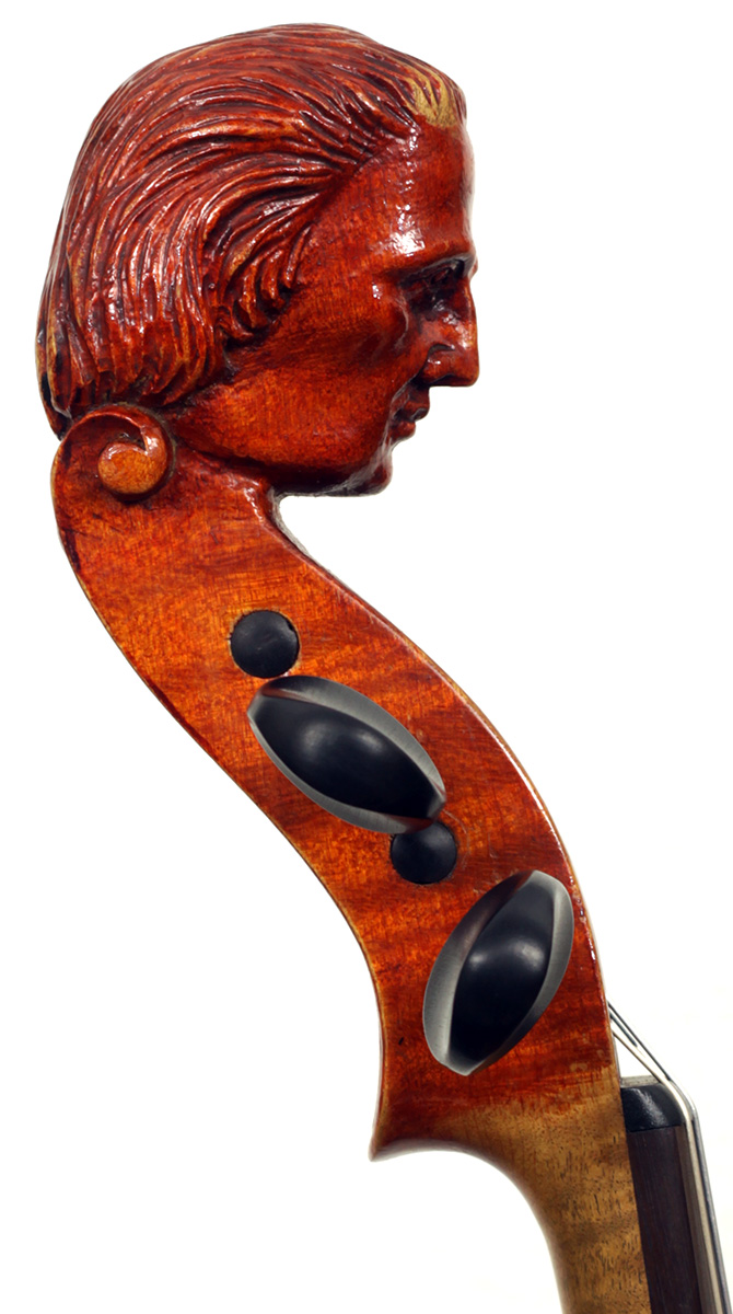 The most striking feature in this instrument is that it has a carved head, instead of a scroll, ostensibly as a tribute to Stradivari. Furthermore, the back and ribs are of attractive bird's eye maple with very distinct motives in the wood, real eye catcher. The top is of very good tone spruce with a very even medium grain throughout. The red-brown varnish is very translucent and compliments the materials well. Workmanship throughout is refined and steady, conforming to high standards.