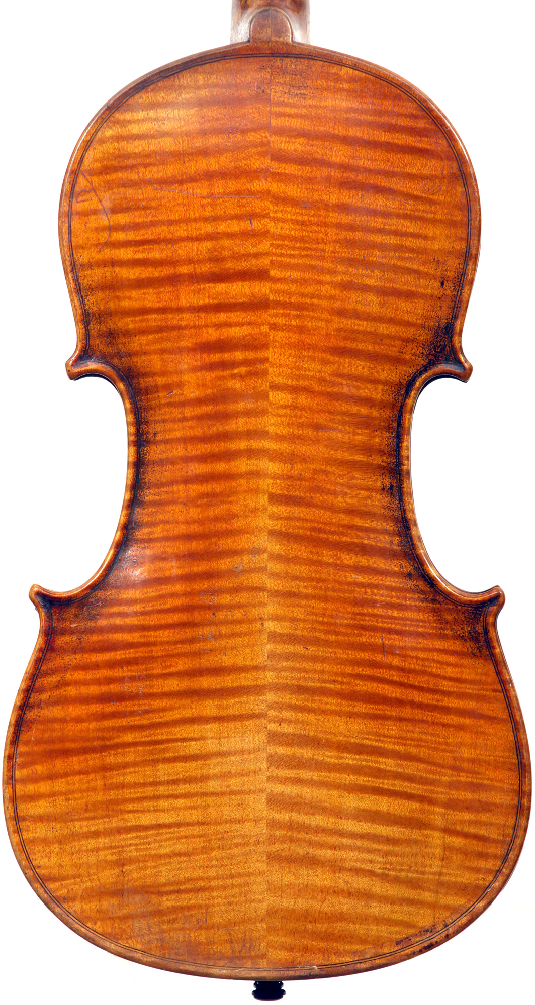 The two piece back, ribs, neck and scroll are of mildly flamed maple. The top is of very good tone spruce with an even medium grain. The Fs and scroll appear somewhat perfunctory but the tracing of the purfling and corner work show an experienced and steady hand. This violin is responsive and easy to play. It would be a suitable intermediate upgrade for a talented student wishing to make progress.