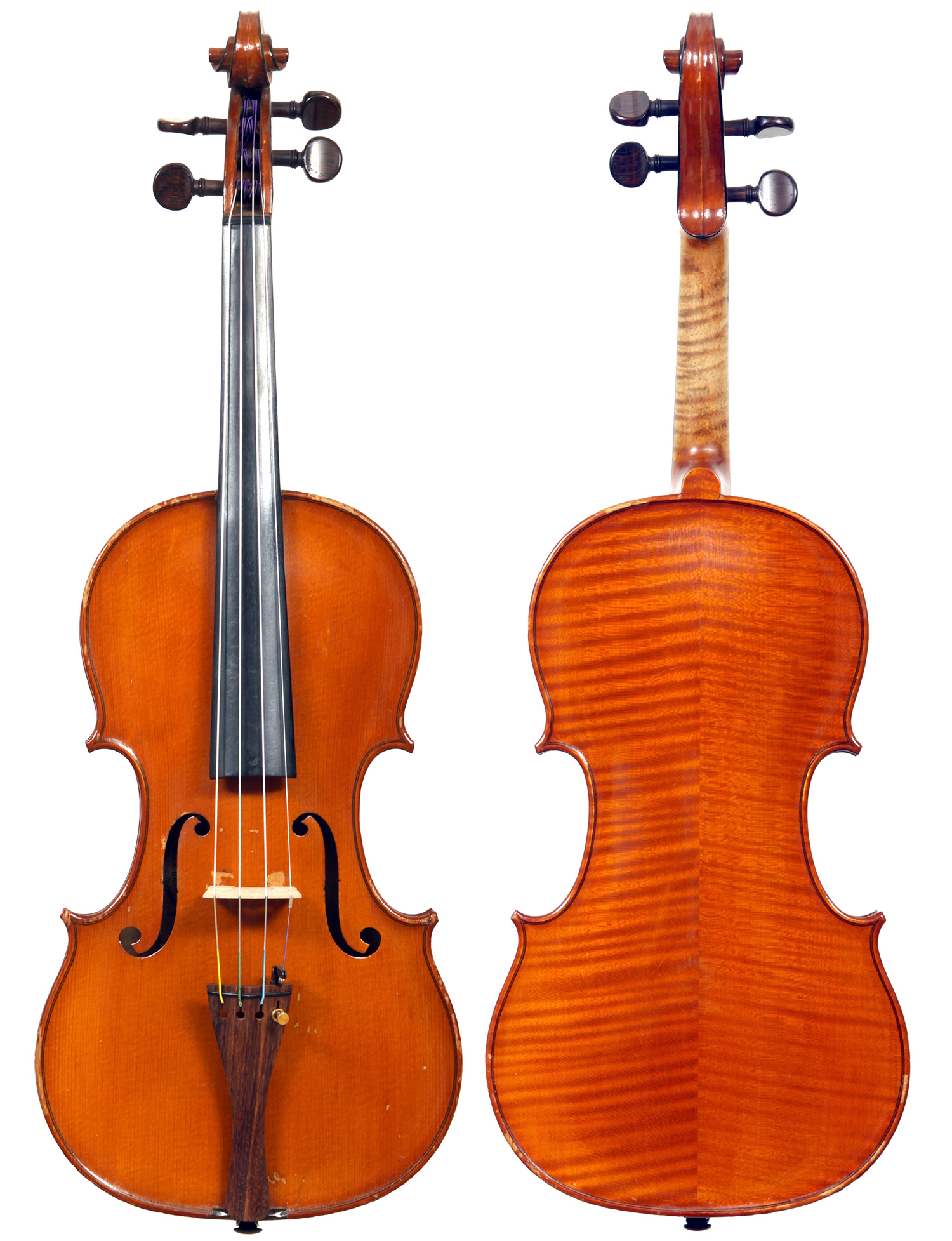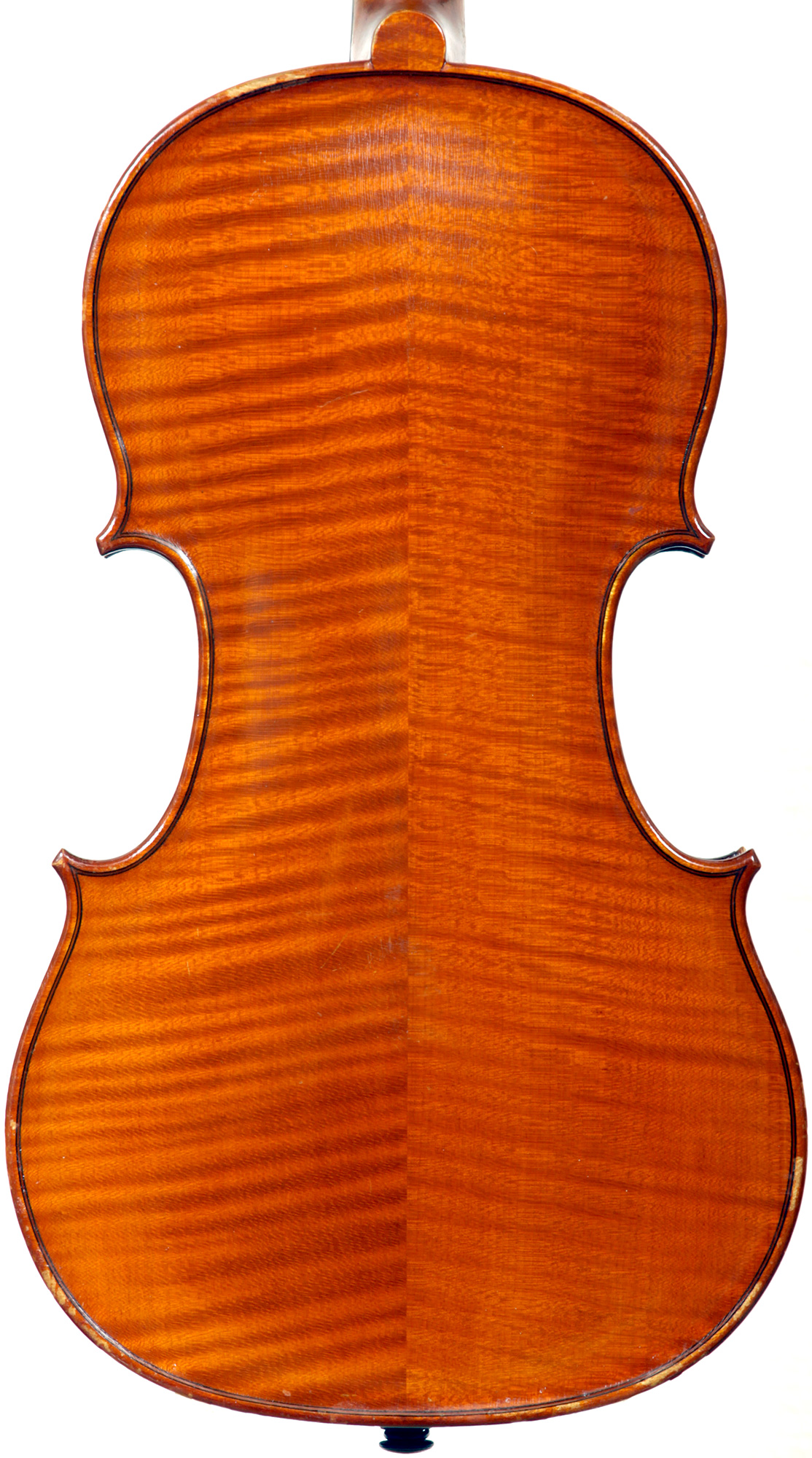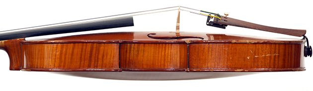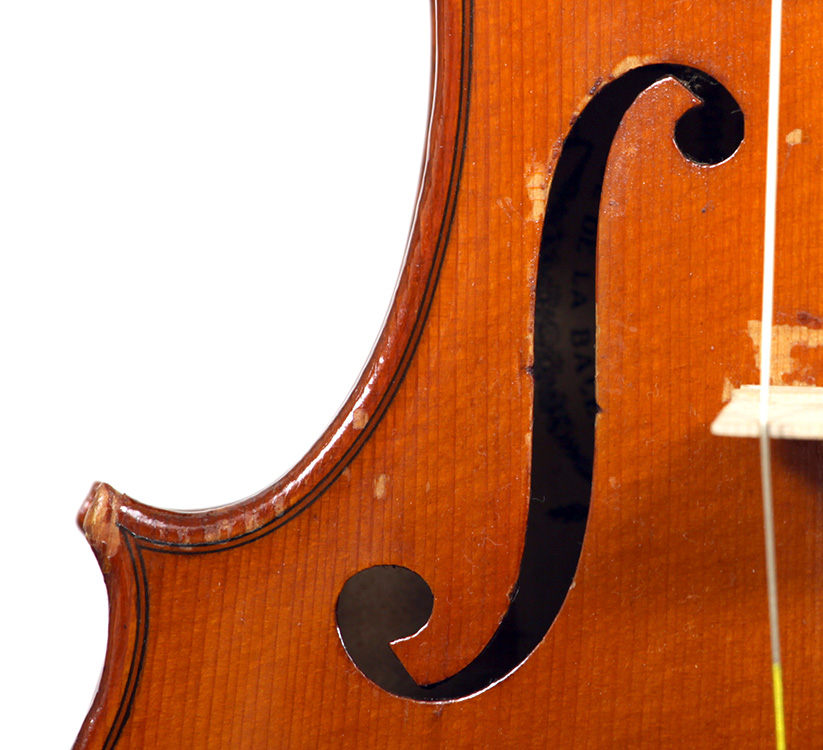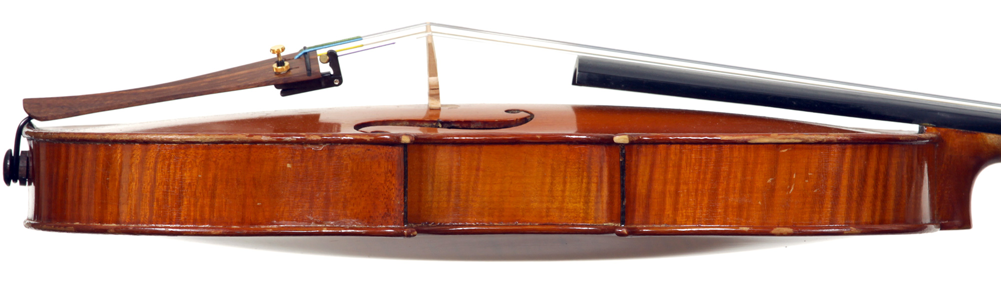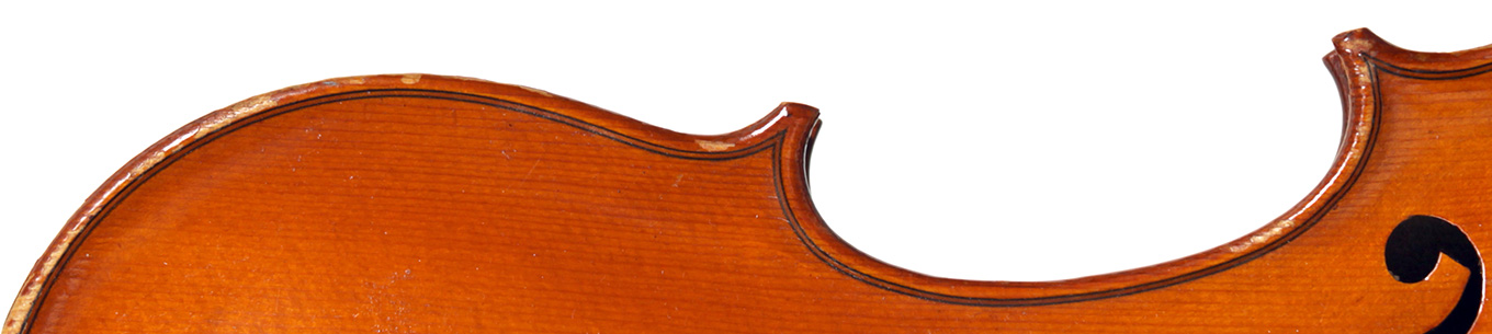 The two-piece back, ribs, neck and scroll are of nicely flamed maple with a medium to narrow curl. The top is of excellent tone spruce. The somewhat narrow corners are a characteristic of this studio's work, and the scroll and Fs are well-balanced and elegant. Workmanship throughout shows a steady hand and conforms to the standards of good French violin making.