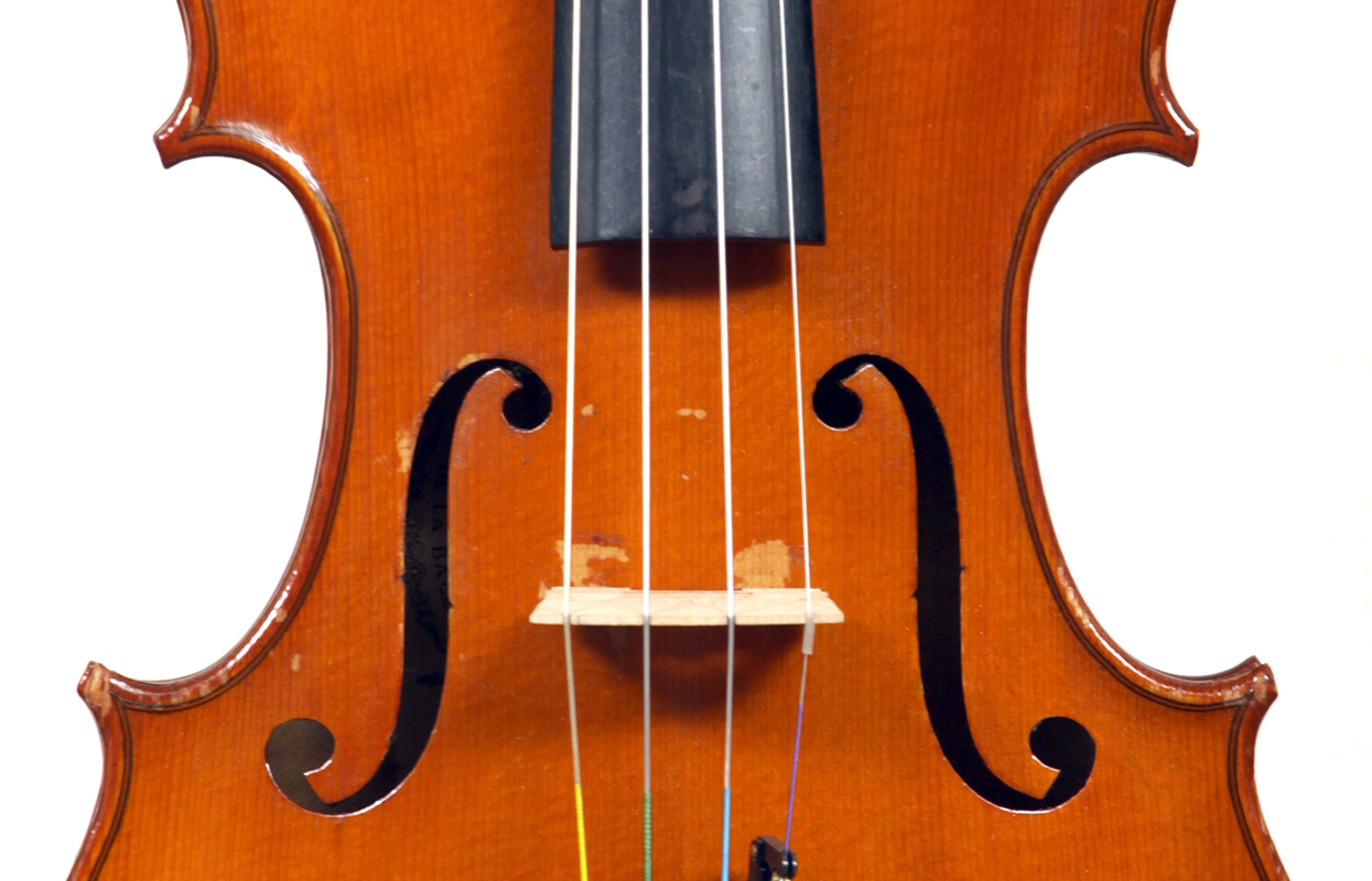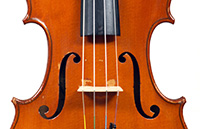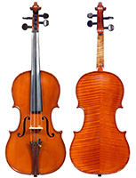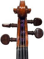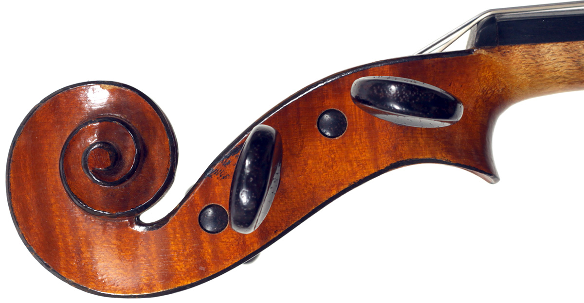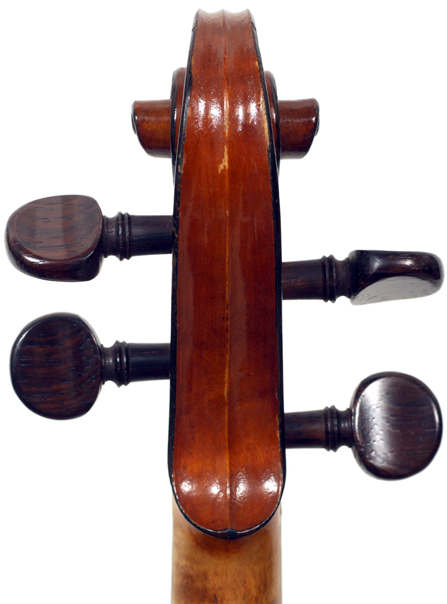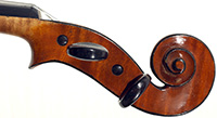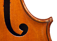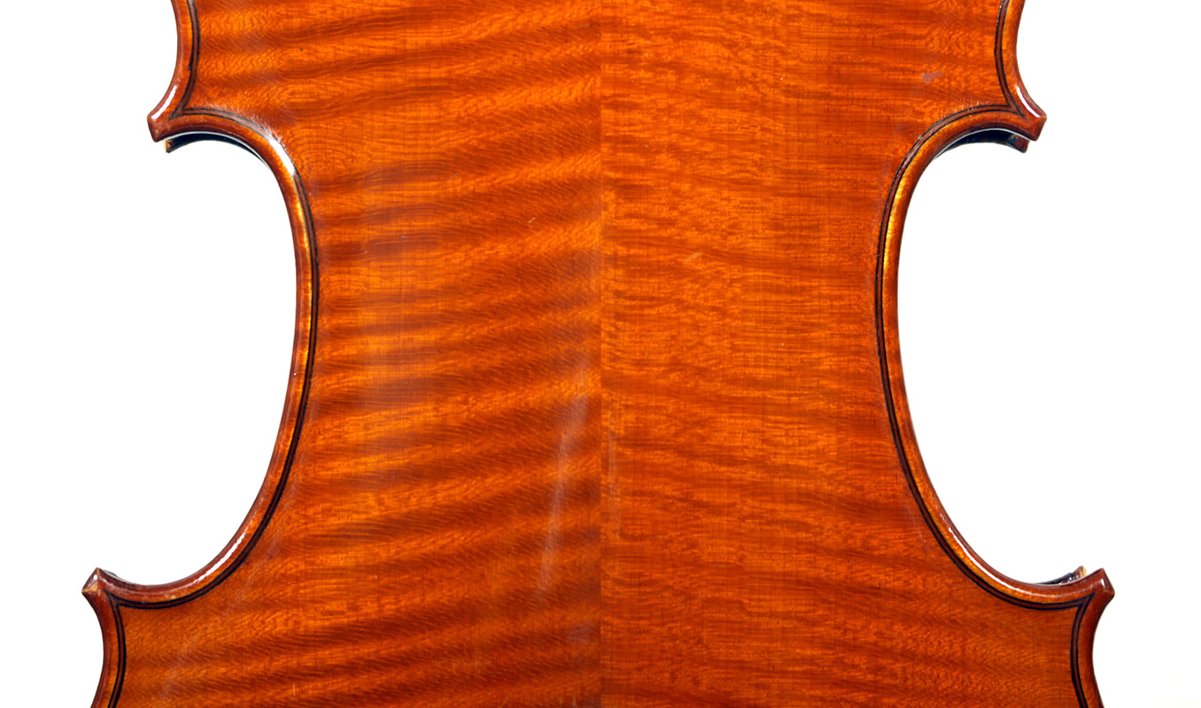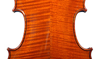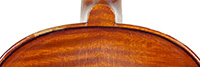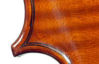 The two-piece back, ribs, neck and scroll are of nicely flamed maple with a medium to narrow curl. The top is of excellent tone spruce. The somewhat narrow corners are a characteristic of this studio's work, and the scroll and Fs are well-balanced and elegant. Workmanship throughout shows a steady hand and conforms to the standards of good French violin making.