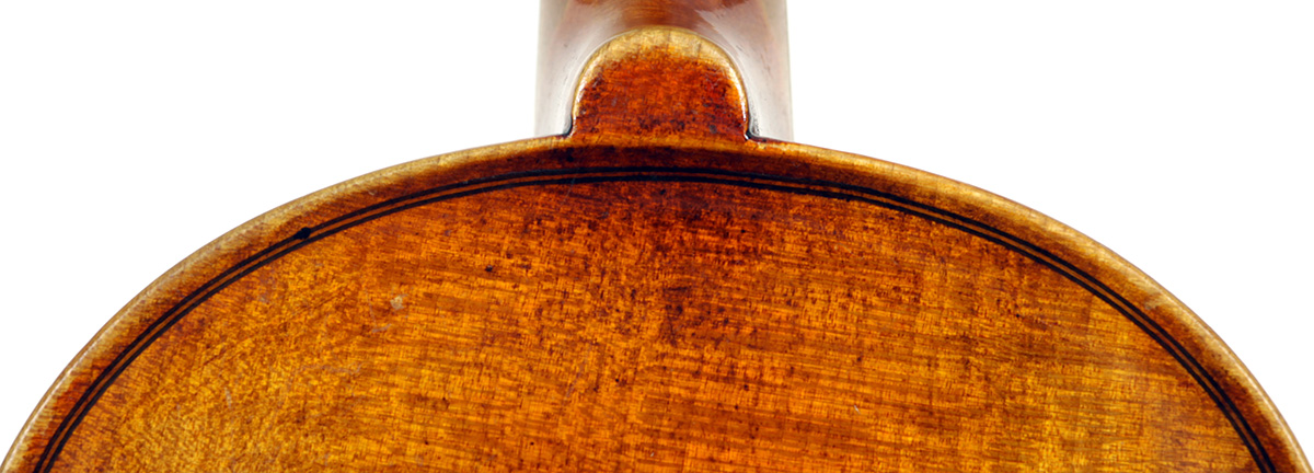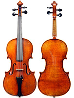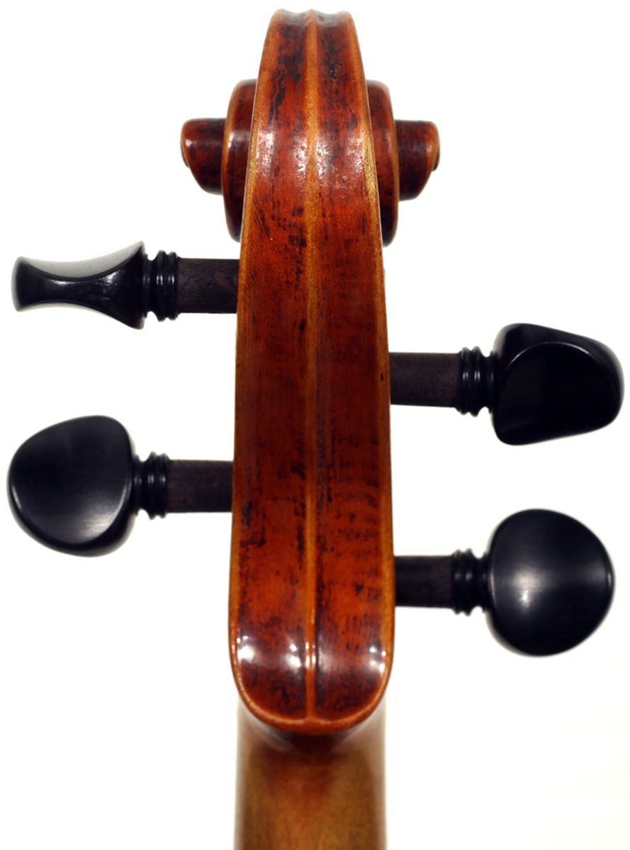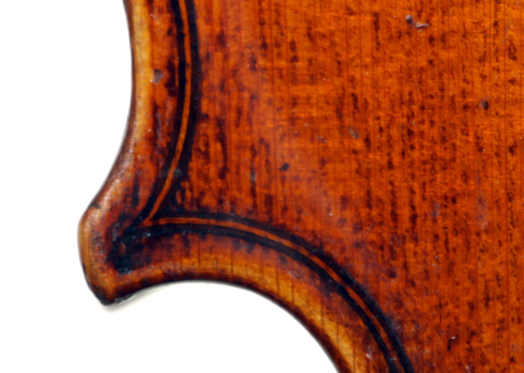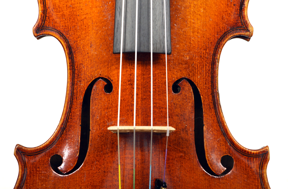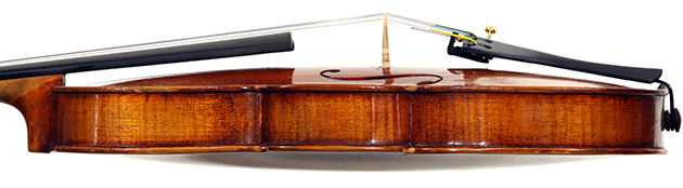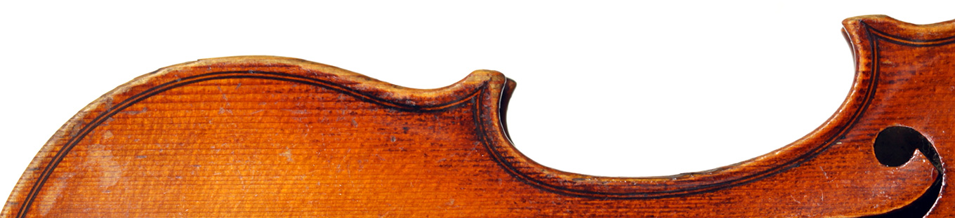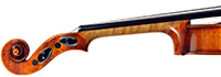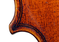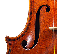 This violin is no exception. It is based on the Stradivari pattern. The top is of excellent tone spruce with a medium to fine grain. The one-piece back is truly attractive and of excellent mildly figured maple. The varnish is a lovely amber-brown which complements the materials well.