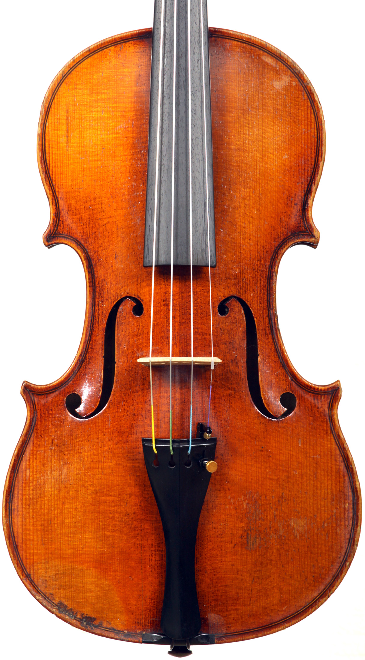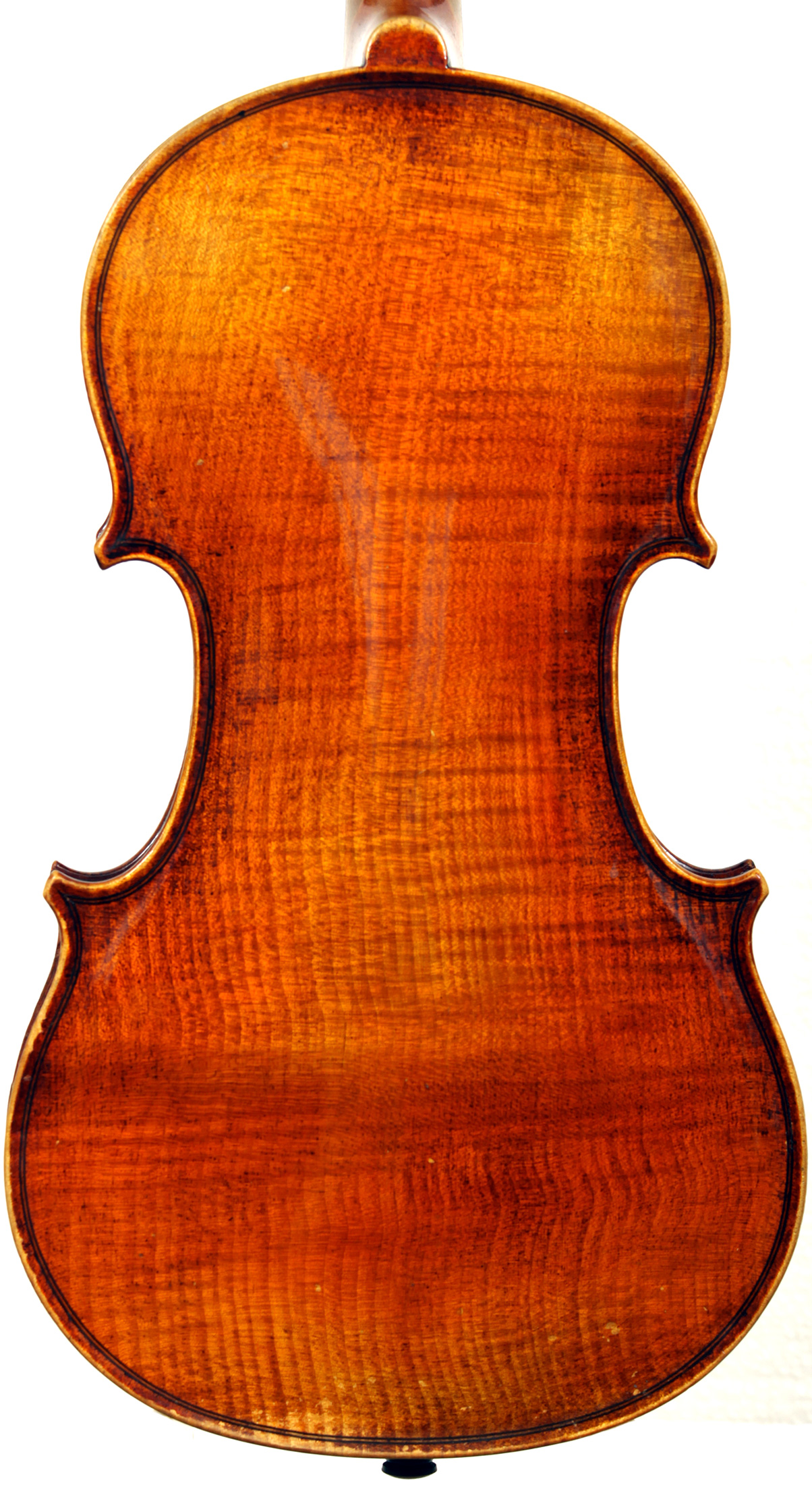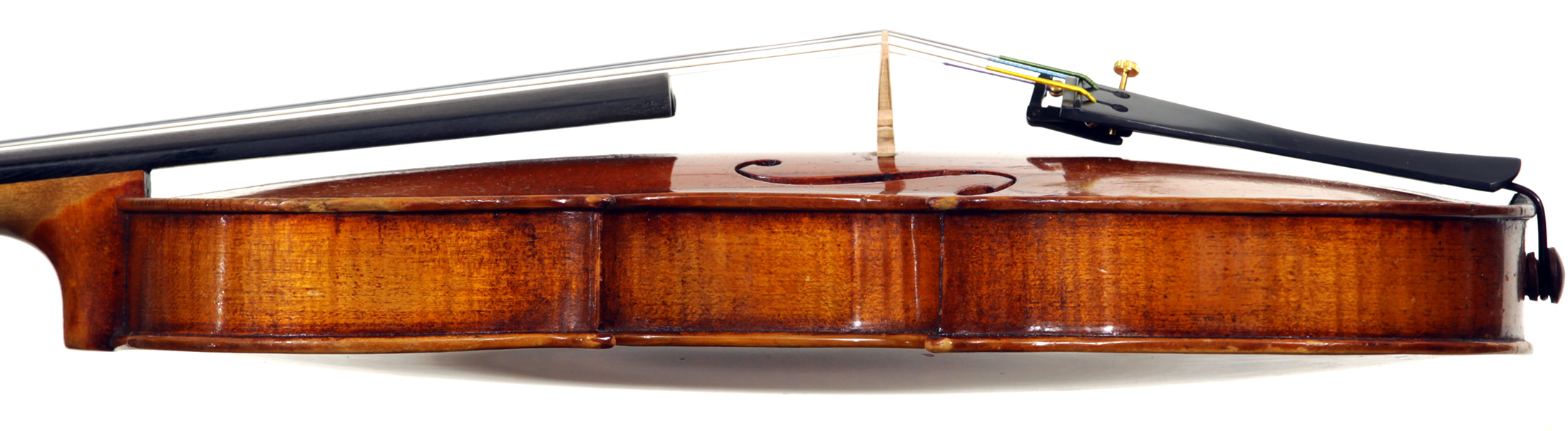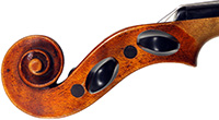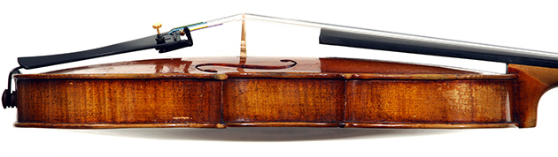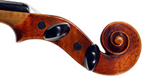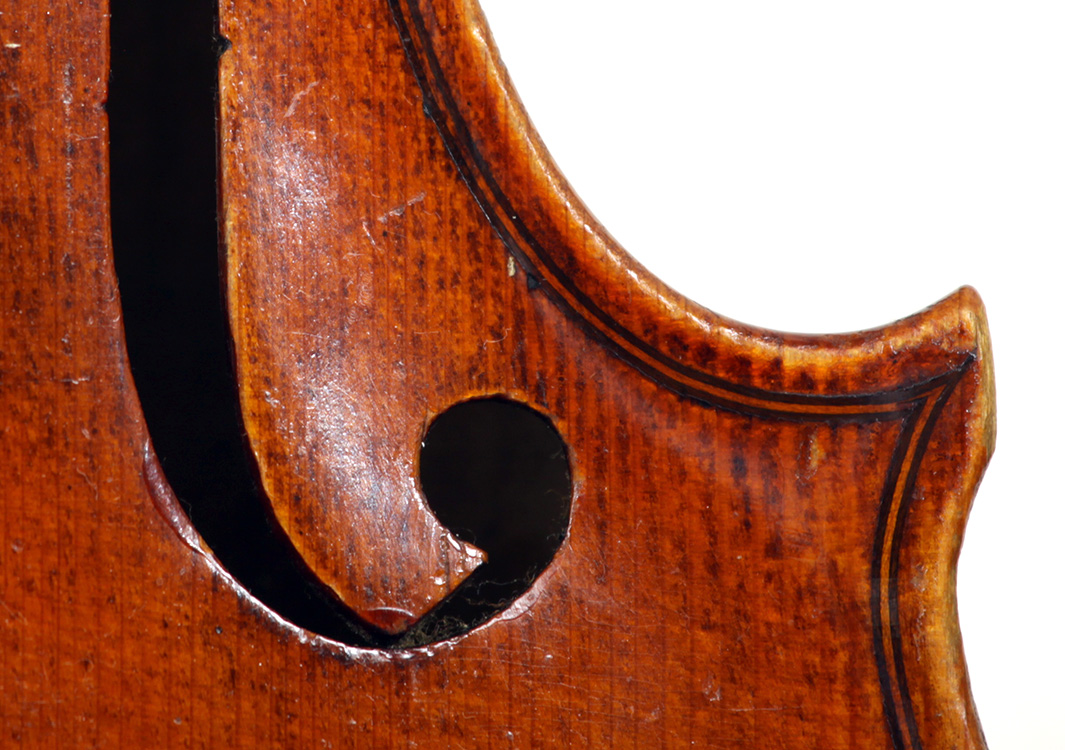 This violin is no exception. It is based on the Stradivari pattern. The top is of excellent tone spruce with a medium to fine grain. The one-piece back is truly attractive and of excellent mildly figured maple. The varnish is a lovely amber-brown which complements the materials well.