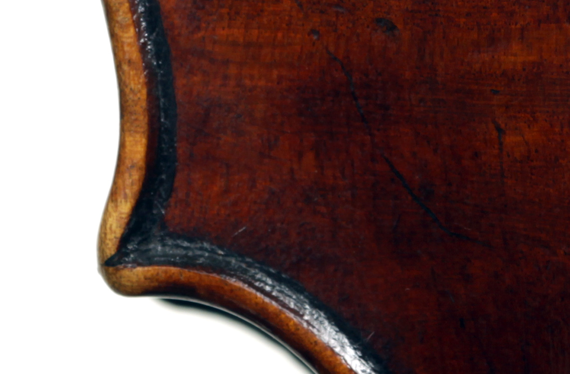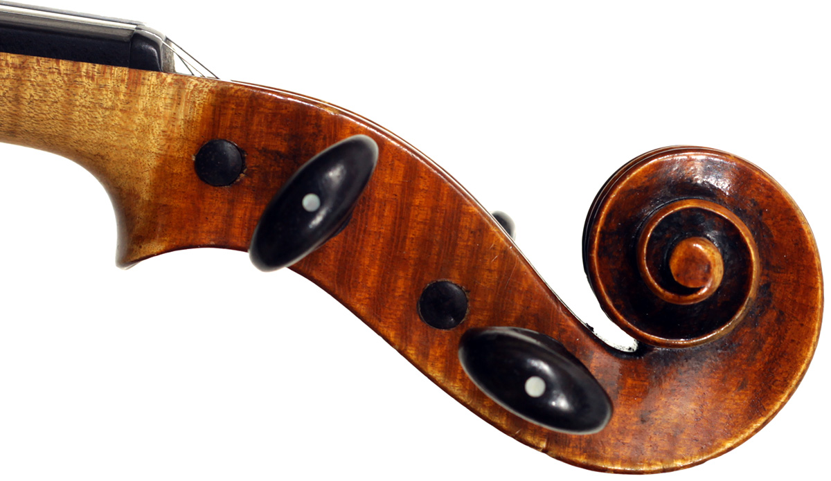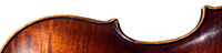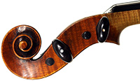 Workmanship in this violin is really good. The one-piece back and the ribs are of nicely flamed maple with a straight medium curl. The neck an scroll use more figured wood and reflect refinement and attention to detail. The scroll is truly elegant and beautifully crafted. The top is of good tone spruce with medium grain at the bass flank narrowing to the treble side.