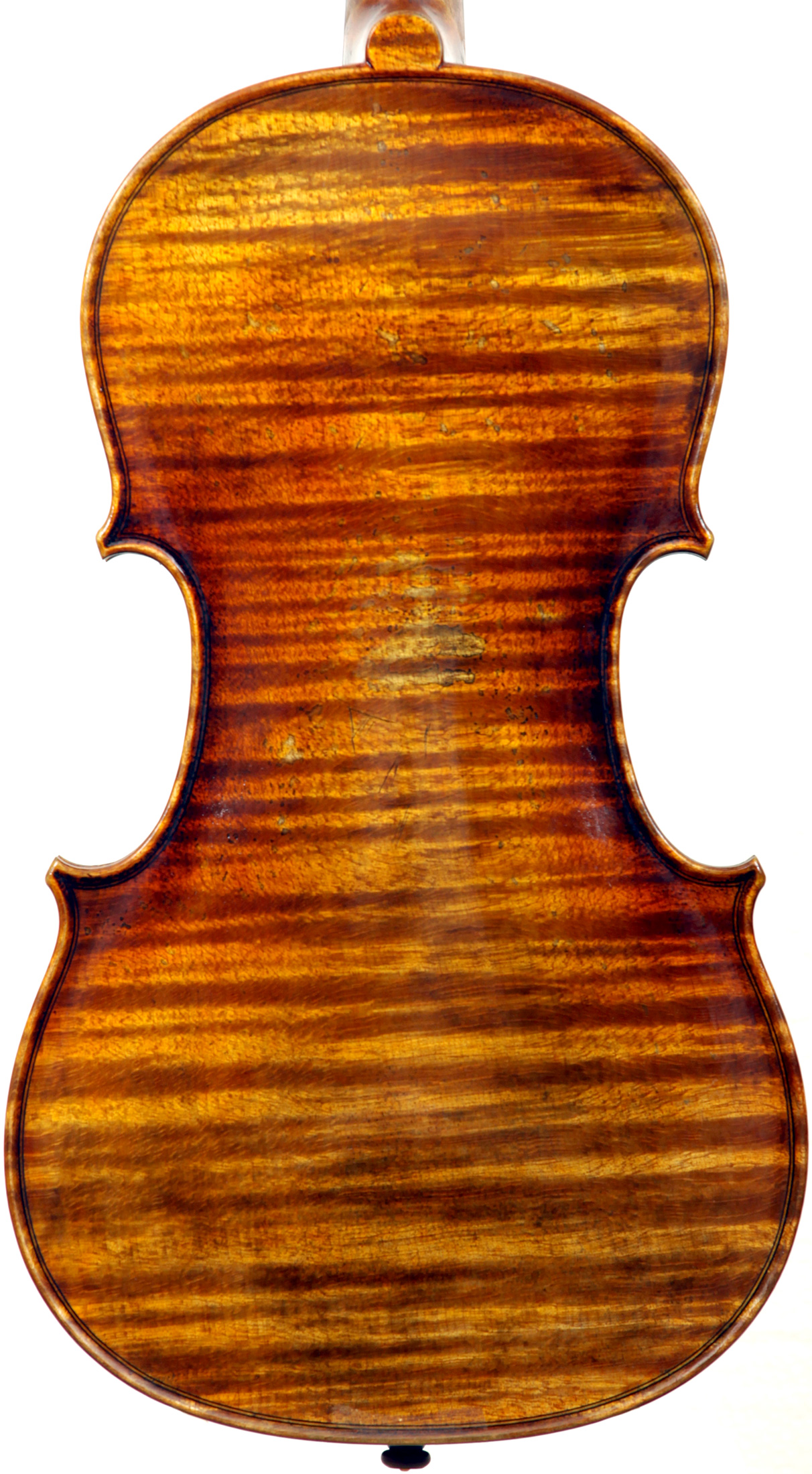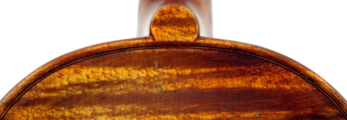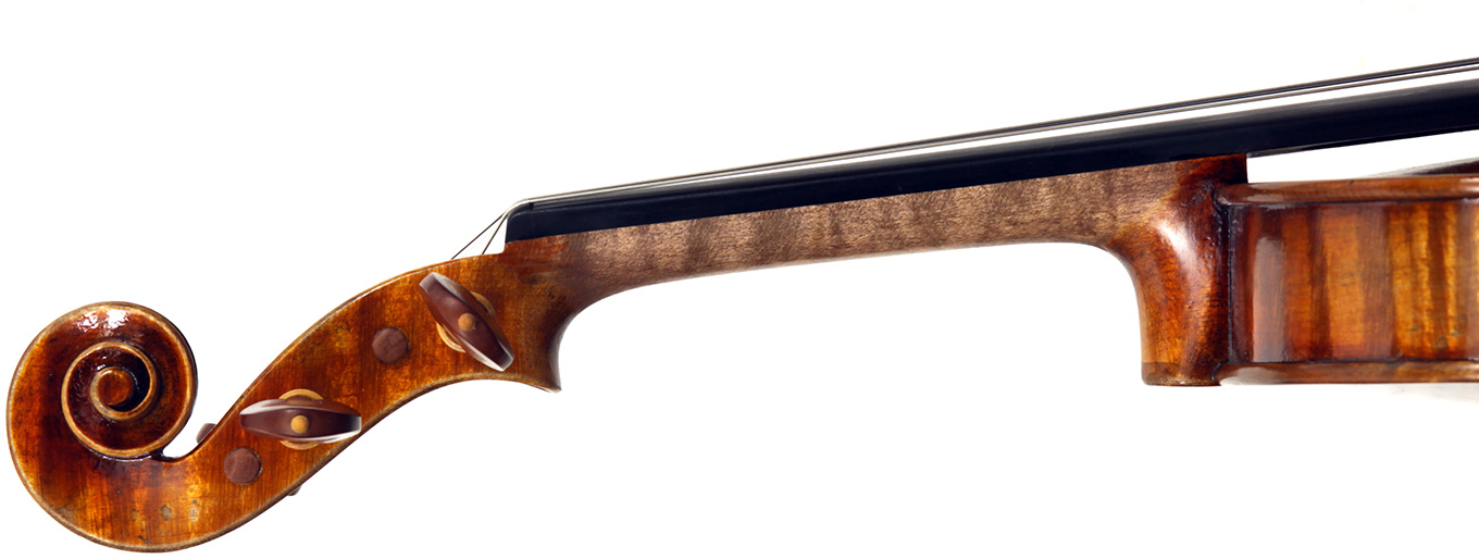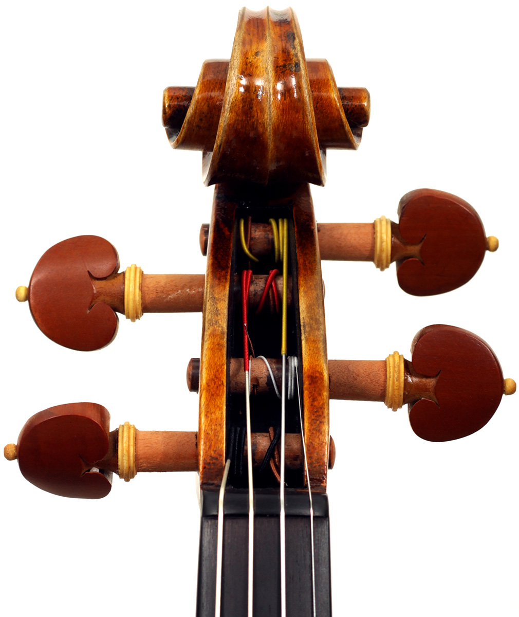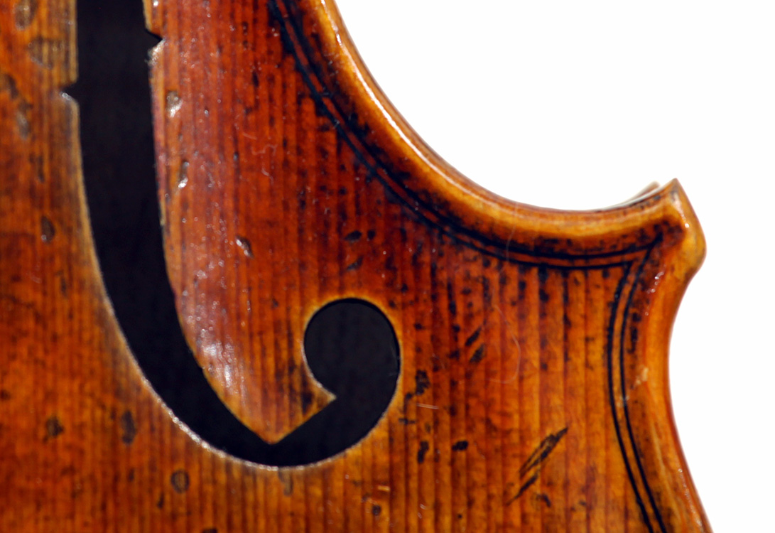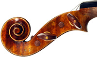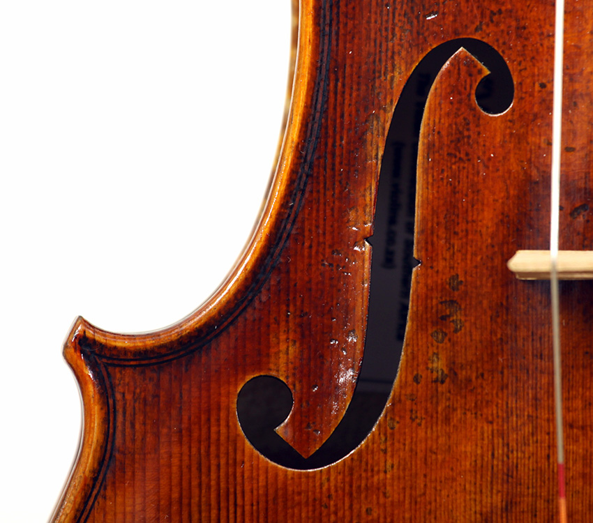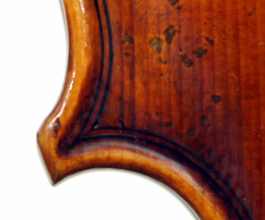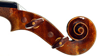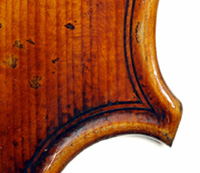 The oil varnish is a beautiful blend of light amber-brown over a yellow ground. The antiquing is truly cleverly done, adding greatly to this violin's high visual appeal. The current boxwood fittings beautifully match this. Also, this instrument is unusually light in the hand - a good sign for desired tonal response, which doesn't disappoint.