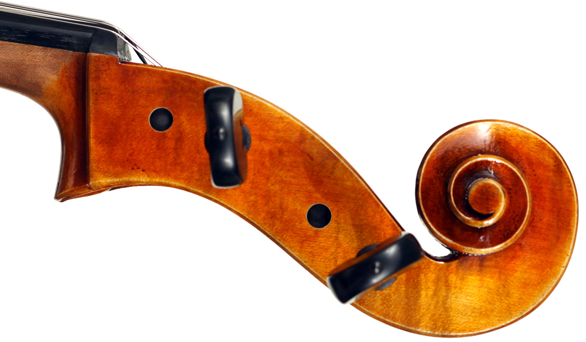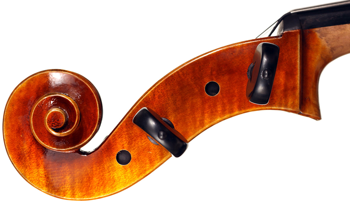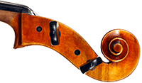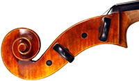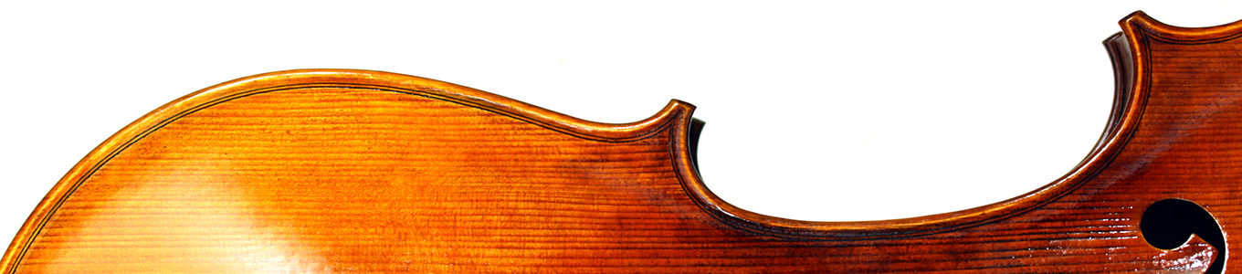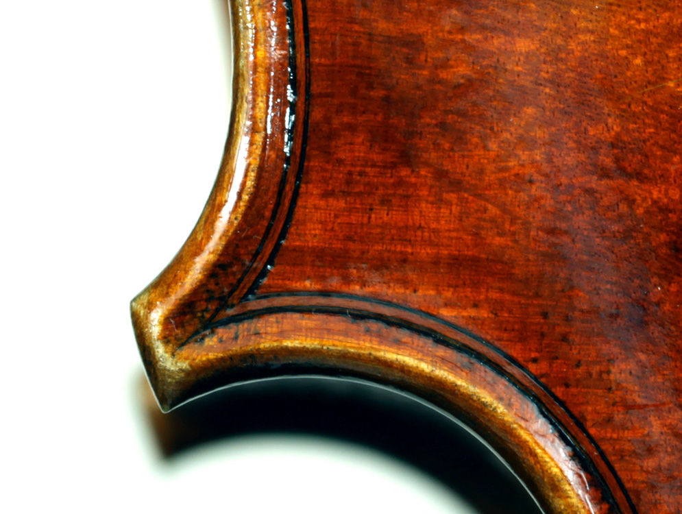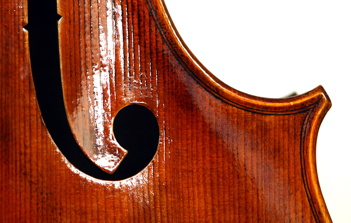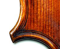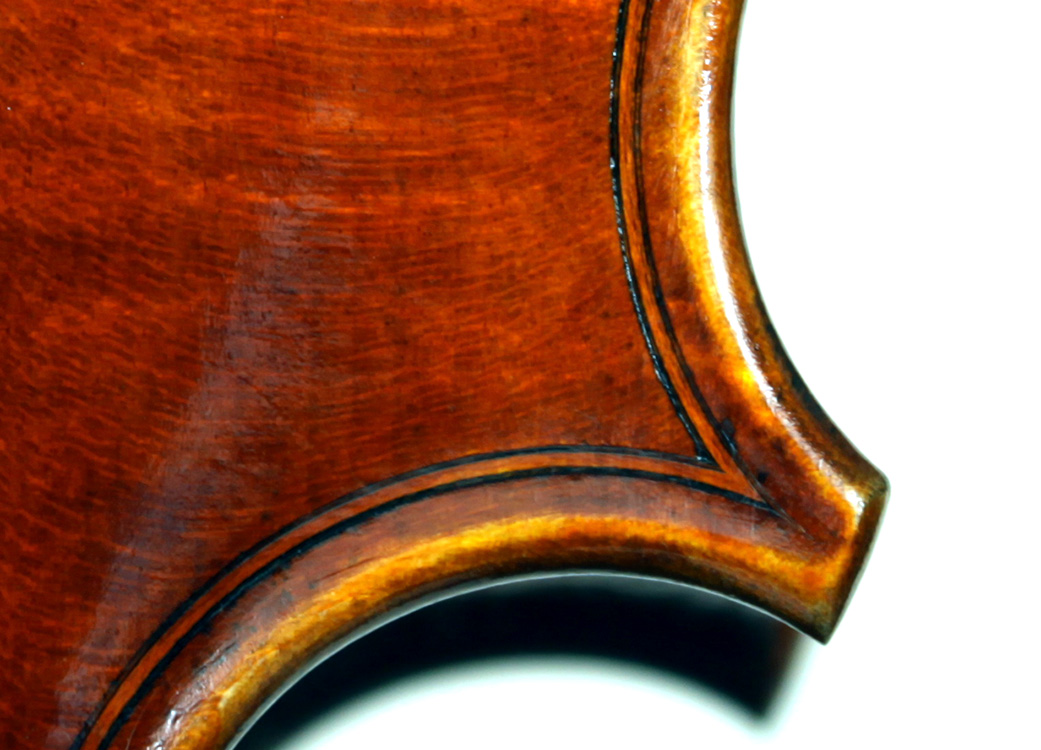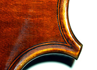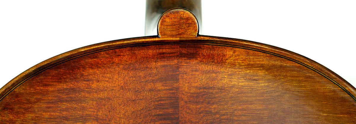 One notices the flawless attention to detail, particularly in the tracing of the purfling, the outstanding cornerwork and mitres, and also in the scroll, which is balanced and elegant.