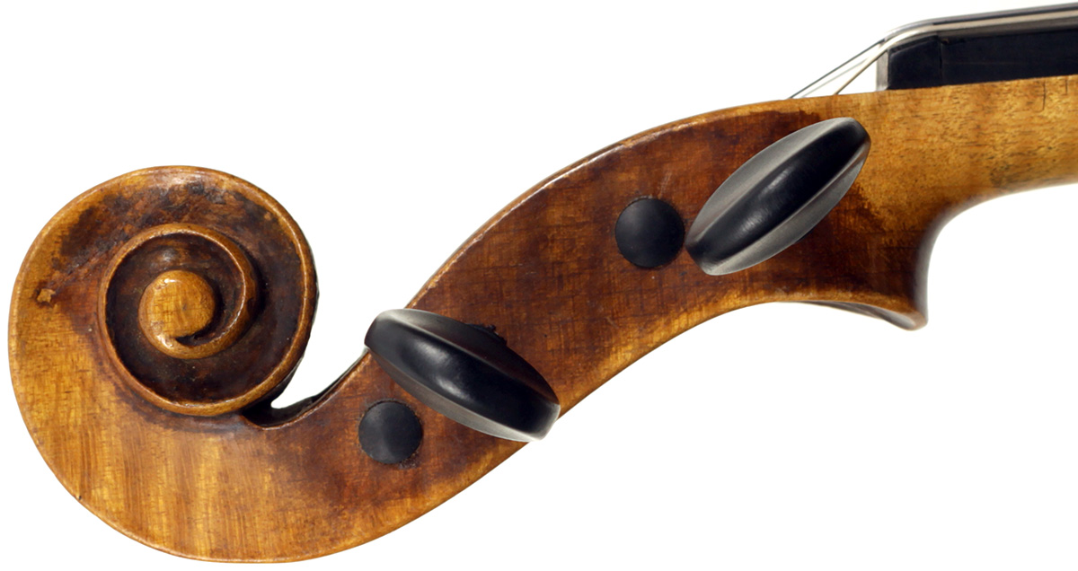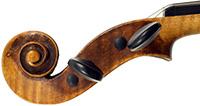 This violin is built on the Maggini pattern, which is slightly wider and longer than usual with fairly flat arching, double purfling and elongated sound holes. These copies were very popular among violin making workshops in France and Germany. The master, J. B. Vuillaume, had many Maggini copies made in his workshops as did the French firm of Jérôme Thibouville-Lamy and the workshop and studio of Justin Derazey, to which this instrument is attributed.