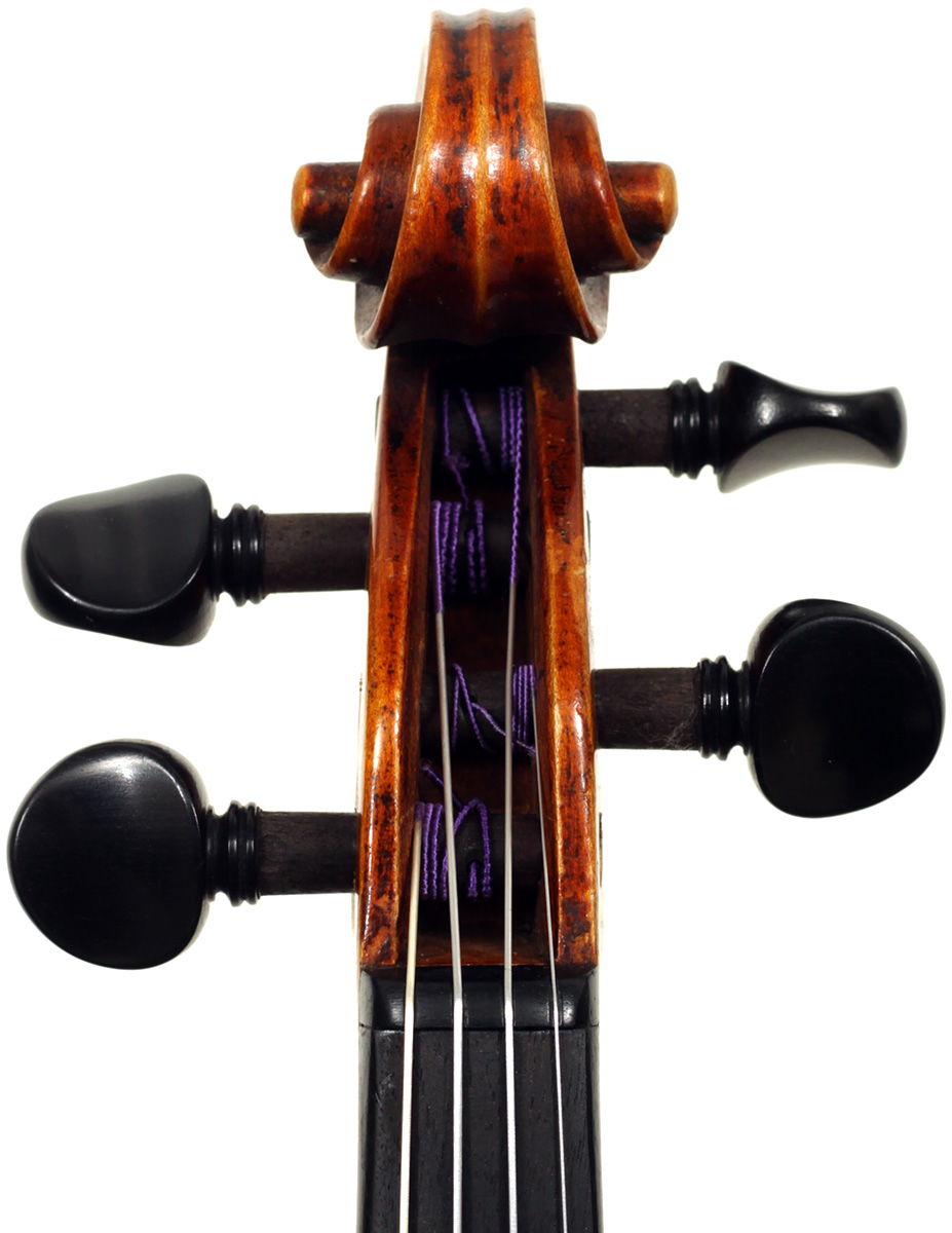 This violin is no exception. It is based on the Stradivari pattern. The top is of excellent tone spruce with a medium to fine grain. The one-piece back is truly attractive and of excellent mildly figured maple. The varnish is a lovely amber-brown which complements the materials well.